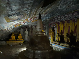 En haut, cinq grottes séparées abritent quelques 157 peintures et statues de Bouddha. Les premières effigies datent du 1er siècle av. J.-C. et les rois successifs ont rajouté des œuvres au fil des siècles pour embellir le sanctuaire. Bouddhas couchés, bouddhas assis, couverts de feuilles d’or ou simplement peints, il y en a pour tous les goûts. Des divinités hindoues sont également représentées.