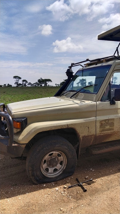 The absence of big cats and elephants leaves us a little hungry, but we do not give up hope for the rest of the safari. For now, we prefer to pretend being mechanics in order to change the completely flat wheel of our jeep in the middle of the savannah. Only the lions are missing!