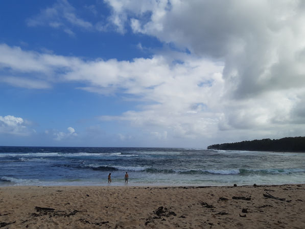 Our efforts were worth it, since it is on the edge of an almost deserted beach that we have the leisure to bathe (and yes, Anouck's leg is very dry under a water-resistant bandage).